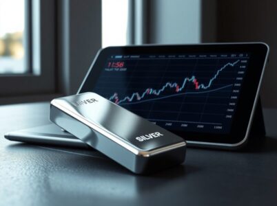 Silver bullion bar next to a tablet showing rising price charts, representing today's silver market rally.